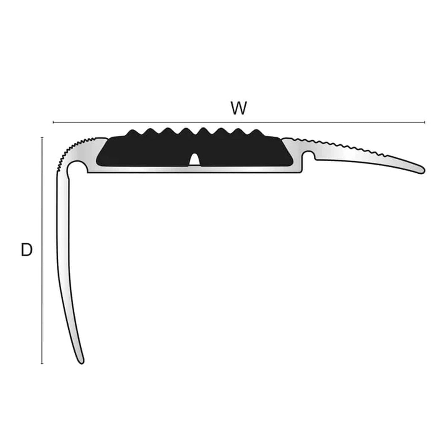 The anodised silver aluminium channel sits over the floor covering to create a secure, protected stair edge, while the 25mm grooved rubber insert delivers confident anti-slip grip underfoot in high-traffic environments.